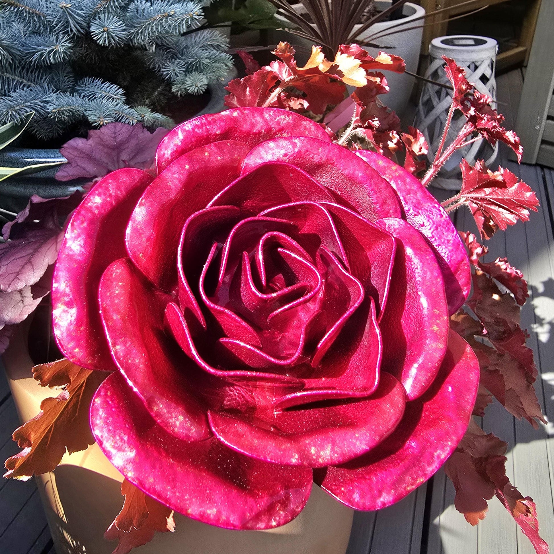 Handcrafted Hot Pink Steel Rose: Indoor Outdoor Garden Decor